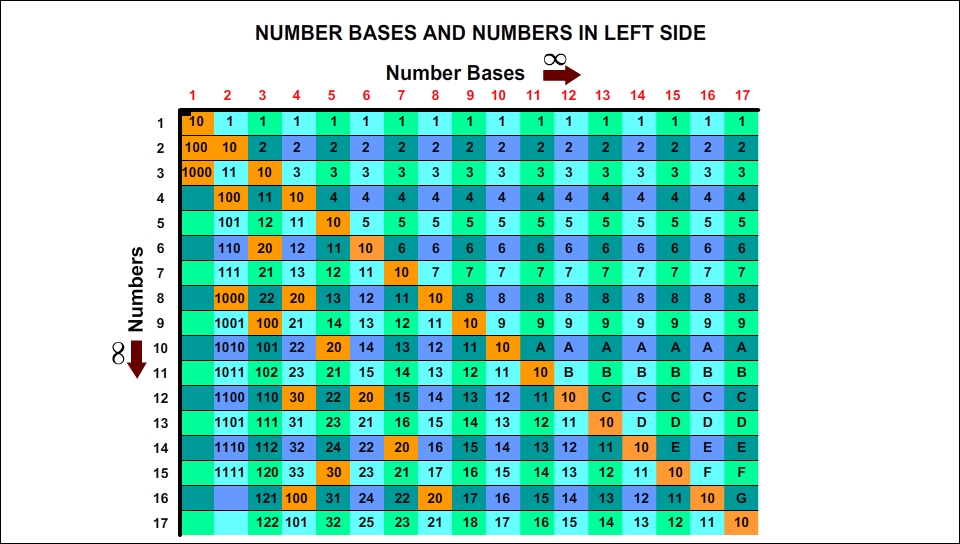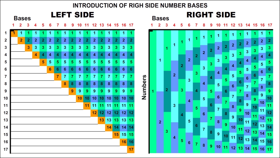 When we make a definition as Right Side in mathematics, naturally at first it is needed to explain what Left Side means in mathematics. Left side represents normal order of number bases that we still use. The table below represents the order of numbers in left side. Normally we handle and use the number bases and numbers as we see in this classic table.