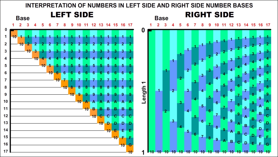 The comparative table below is showing the difference between Left Side number bases and Right Side number bases (The values on the table have been regulated according to the decimal system ignoring the number writing rule.). As can be seen the Right Side numbers forms with the rule: